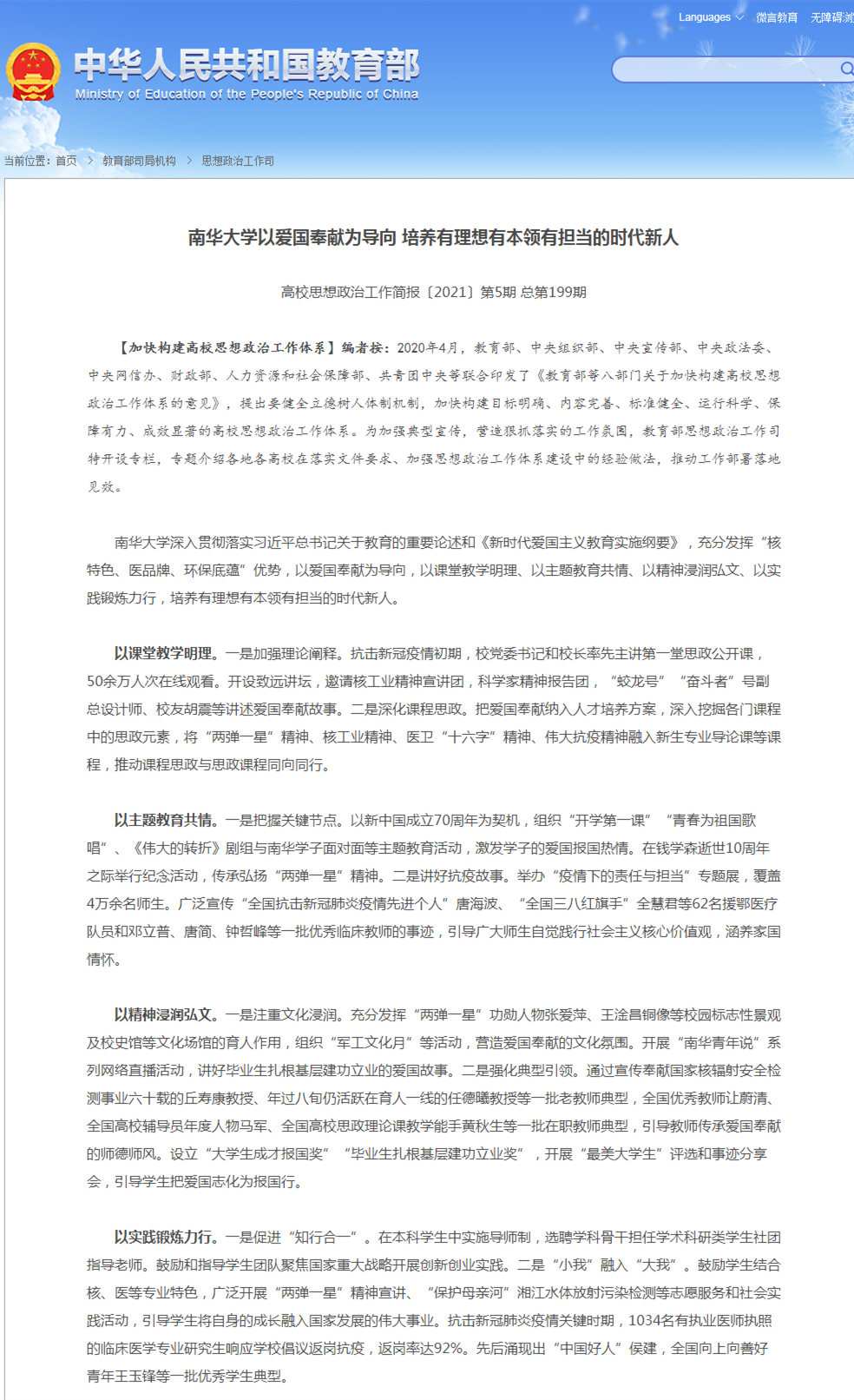 近日,教育部思政司《高校思想政治工作简报》2021年第5期刊发《南华大学以爱国奉献为导向 培养有理想有本领有担当的时代新人》,专题推介我校思想政治工作举措、经验和成效。全文如下: