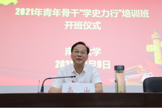 为从党的百年伟大奋斗历程中汲取继续前进的智慧和力量,进一步提升全校中青年干部思想政治素质和办学治校能力,推动学校各项事业高质量发展,5月9日上午,我校在紅湘校区图书馆学术报告厅举行2021年青年骨干“学史力行”培训班开班仪式。校党委书记高山出席并讲授开班第一课,校党委委员、副校长雷小勇主持。