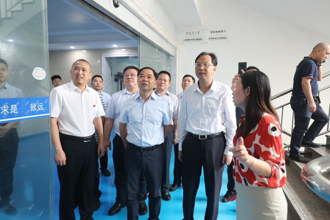 签约仪式前,刘光跃一行实地考察了我校辐射-线粒体与人类重大疾病实验室、线粒体疾病动物模型实验室、线粒体与神经退行性疾病实验室、心血管病研究所等地。衡阳市核技术应用产业链推进办公室聘请我校党委委员、科研与学科建设部部长刘永教授为产业链科技顾问,并颁发了聘书。