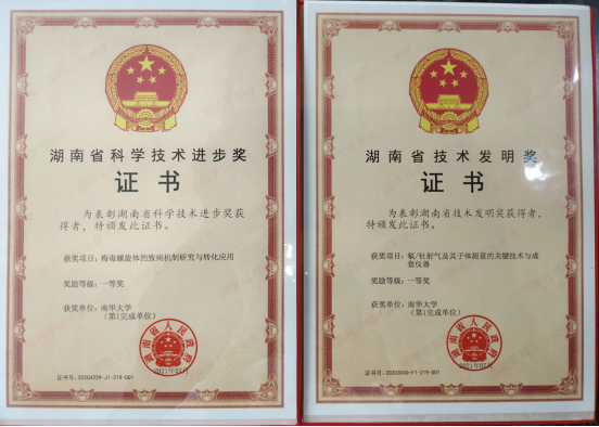 经评审,我校肖德涛教授团队完成的“氡/钍射气及其子体测量的关键技术与成套仪器”被授予湖南省技术发明奖一等奖;吴移谋教授团队完成的“梅毒螺旋体的致病机制研究与转化应用”被授予湖南省科学技术进步奖一等奖;颜拥军教授团队完成的“基于核信号特征的数字化测控技术及其应用”被授予湖南省科学技术进步奖二等奖;钟警教授团队完成的“PRMT2及其剪接体在乳腺癌中的作用及机制研究”被授予湖南省自然科学奖二等奖;杨军教授团队完成的“气体信号分子H2S拮抗心肌纤维化及其机制研究”被授予湖南省自然科学奖三等奖。