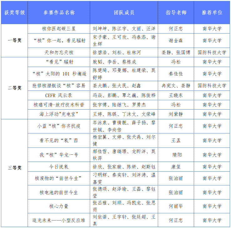 最终,根据评审专家组现场评议,决出一等奖3组,二等奖6组,三等奖8组,南华大学核科学技术学院、国防科技大学文理学院获得优秀组织奖。