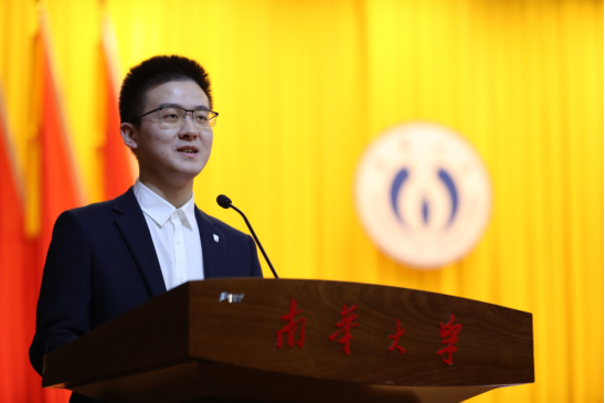 衡阳医学院2018级口腔医学专业程哲彬作学生代表发言。他表示,正是老师们给予的温暖、关怀和鼓励,点亮了每一位学子的成长道路,并塑造着南华青年的精神和品格。对老师最好的报答和感谢就是以老师为榜样,弘扬“勤勉务实、甘于奉献、刚健自强、敢为人先”的南华精神,为成为一名“心中有梦、眼中有光、肩上有责、脚下有力”的新时代卓越人才而不懈努力。