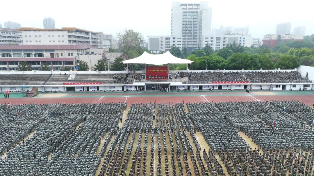 9月30日上午,南华大学2025级新生军训成果汇报大会在红湘校区北校田径场举行。一万余名本科新生以意气风发、朝气蓬勃的精神面貌,展示21天的训练成果,共同庆祝新中国成立76周年。全体在校校领导出席大会。大会由党委委员、副校长王利华主持。