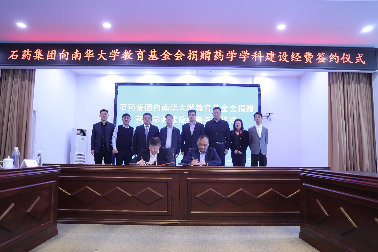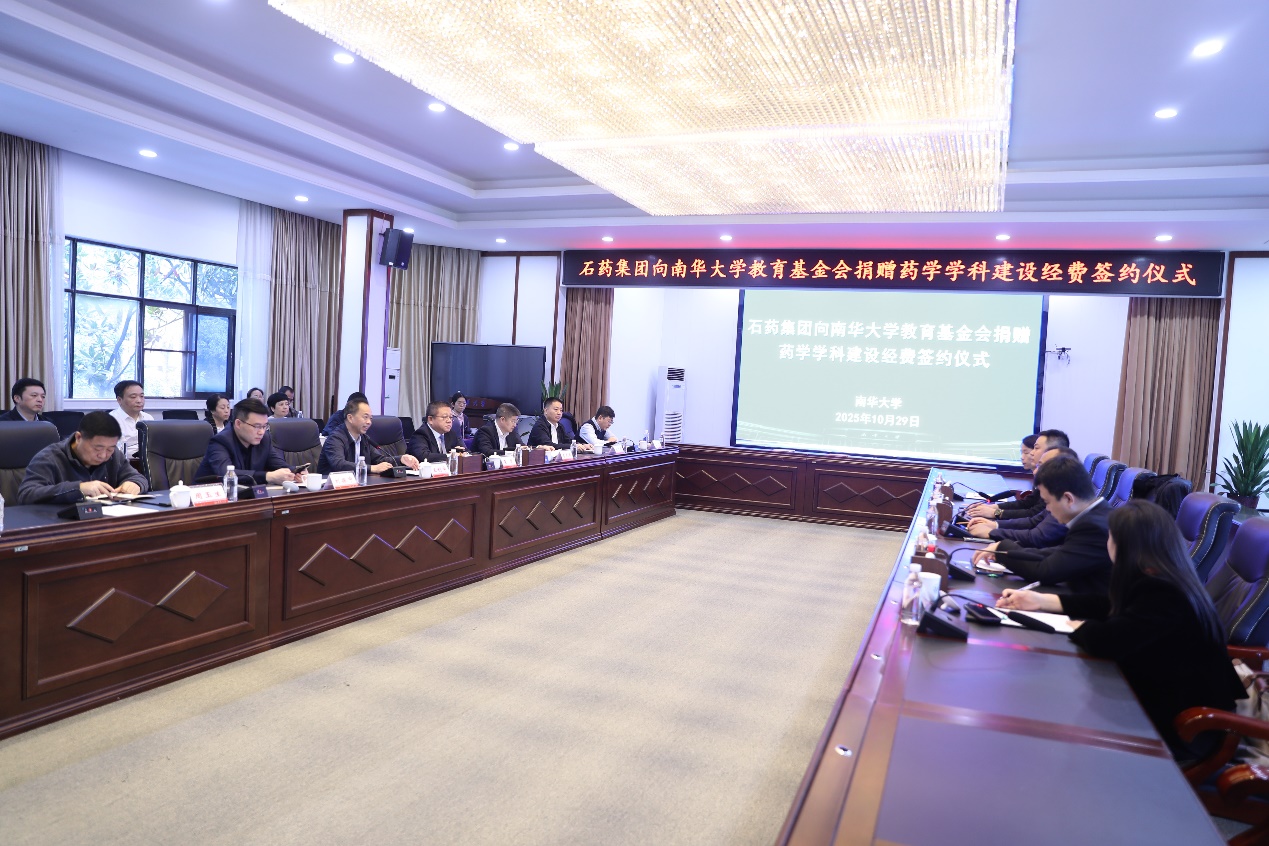 10月29日,石药集团向南华大学教育基金会捐赠药学学科建设经费签约仪式在南华大学第一办公楼视频会议室举行。党委委员、副校长王利华主持仪式。党委委员、副校长夏昆,石药集团药品事业部总裁于立朝出席捐赠仪式。