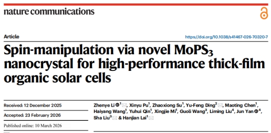 近日,南华大学机械工程学院李振业教授团队在Nature Communications上发表了题为“Spin-manipulation via novel MoPS3nanocrystal for high-performance thick-film organic solar cells”的重要研究成果。该研究创新性地提出了一种基于自旋调控的激子动力学优化策略,通过开发新型二维铁磁MoPS3纳米晶,在活性层内自发形成弱内禀磁场并通过重原子效应增强自旋-轨道耦合,显著促进单重态激子向长寿命三重态激子的系间窜越过程,延长了激子扩散长度,并抑制了非辐射复合损失,最终实现厚膜有机太阳能电池光伏性能的显著增强,对推动有机太阳电池实现大规模卷应用具有重要的科学价值。李振业教授为论文第一作者及通讯作者,南华大学机械工程学院为论文第一署名单位。