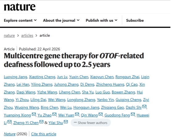 该研究题为Multicentre gene therapy for OTOF-related deafness followed up to 2.5 years(OTOF耳聋基因治疗多中心2.5年随访研究),研究了创新基因治疗对OTOF基因突变所致DFNB9先天性耳聋长达2.5年的多中心随访结果,探索疗效预判核心生物标志物,这是全球首个先天性耳聋基因治疗临床试验,也是目前受试者最多、随访时间最长、年龄覆盖最广的临床证据,系统证实了基因治疗在各年龄段安全有效,发现了疗效预判标志物,为先天性耳聋精准诊疗奠定全新临床基础。南华大学附属第二医院作为全国8家核心单位之一,深度参与此项里程碑式临床研究,高质量完成了受试者招募、临床干预、规范随访与数据采集,为研究的安全性、有效性验证提供了关键临床支撑,共同推动先天性耳聋基因治疗迈向临床推广新阶段。
